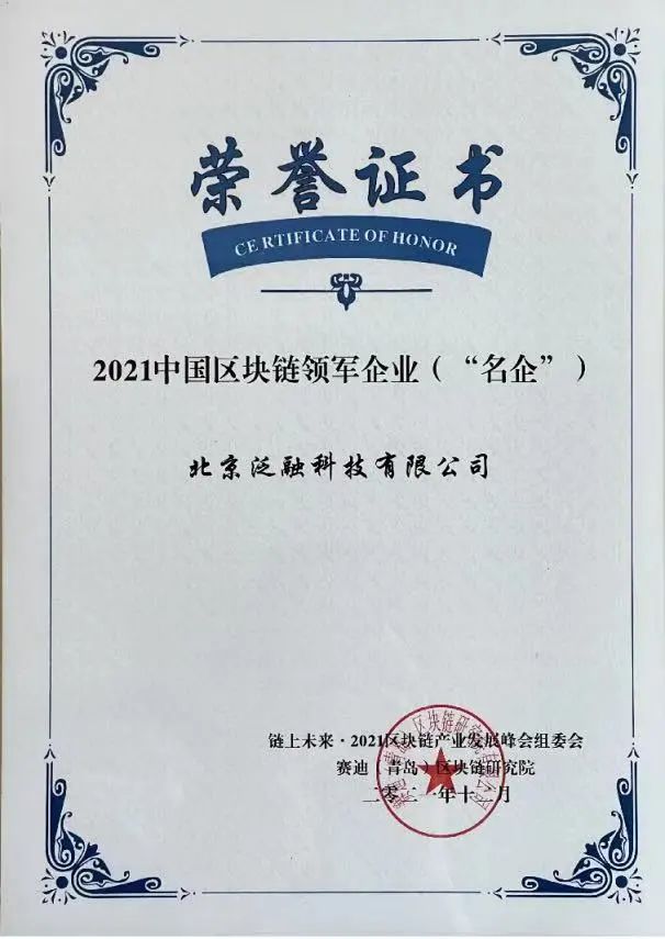 2021中国区块链领军企业(“名企”)证书由链上未来·2021区块链产业开展峰会组委会、赛迪(青岛)区块链研究院联合颁发。